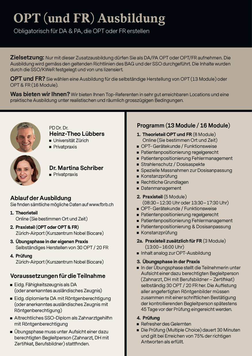 • OPT & FR: CHF 1400.– exkl. MwSt. (Theorieteil, Praxisteile OPT & FR, Prüfung)