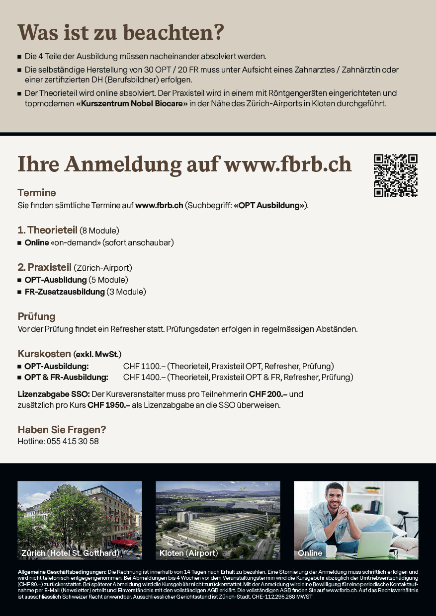 • Die selbständige Herstellung von 30 OPT / 20 FR muss unter Aufsicht eines Zahnarztes / Zahnärztin / DH mit der Bescheinigung eines Berufsbildner erfolgen.